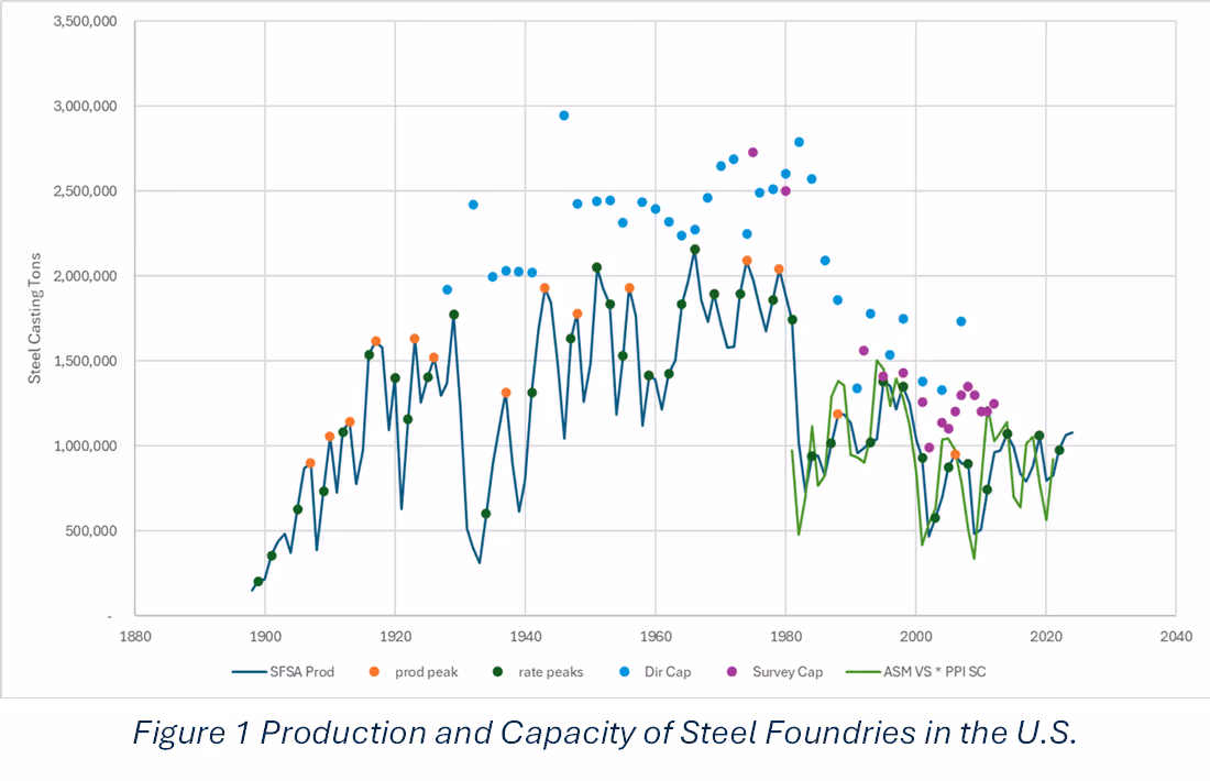 Steel foundries as a capital-intensive industry grew during the capital boom that created much of our critical infrastructure starting in the 1950’s before that demand collapsed after 1982. Like most major capital-intensive industry segments; excess capacity, globalization, continued regulatory and public policy burdens have limited the surviving plants ability to operate profitably enough to invest in modernization and innovation. Since 1980 the industry has lost more than half of the production capability as seen in Figure 1.