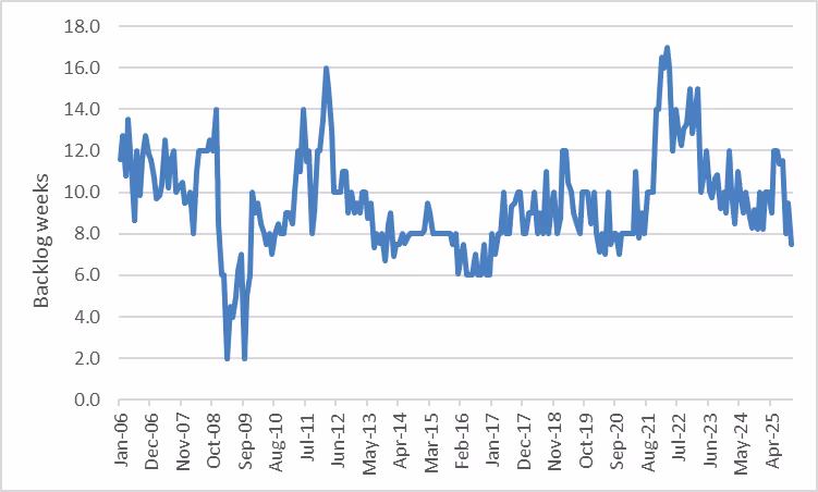 In the capital boom that occurred post 2001, the industry in 2006 and 2007 as seen in Figure 2 had a reported backlog of 8 to 14 weeks. The backlog was dropping slowly as plants were able to hire more workers and make incremental equipment purchases. The backlog then varied from 6 to 16 weeks depending on demand. Backlogs of 8 weeks seems to be “normal” what ever that means. There is also no clear definition of backlog.